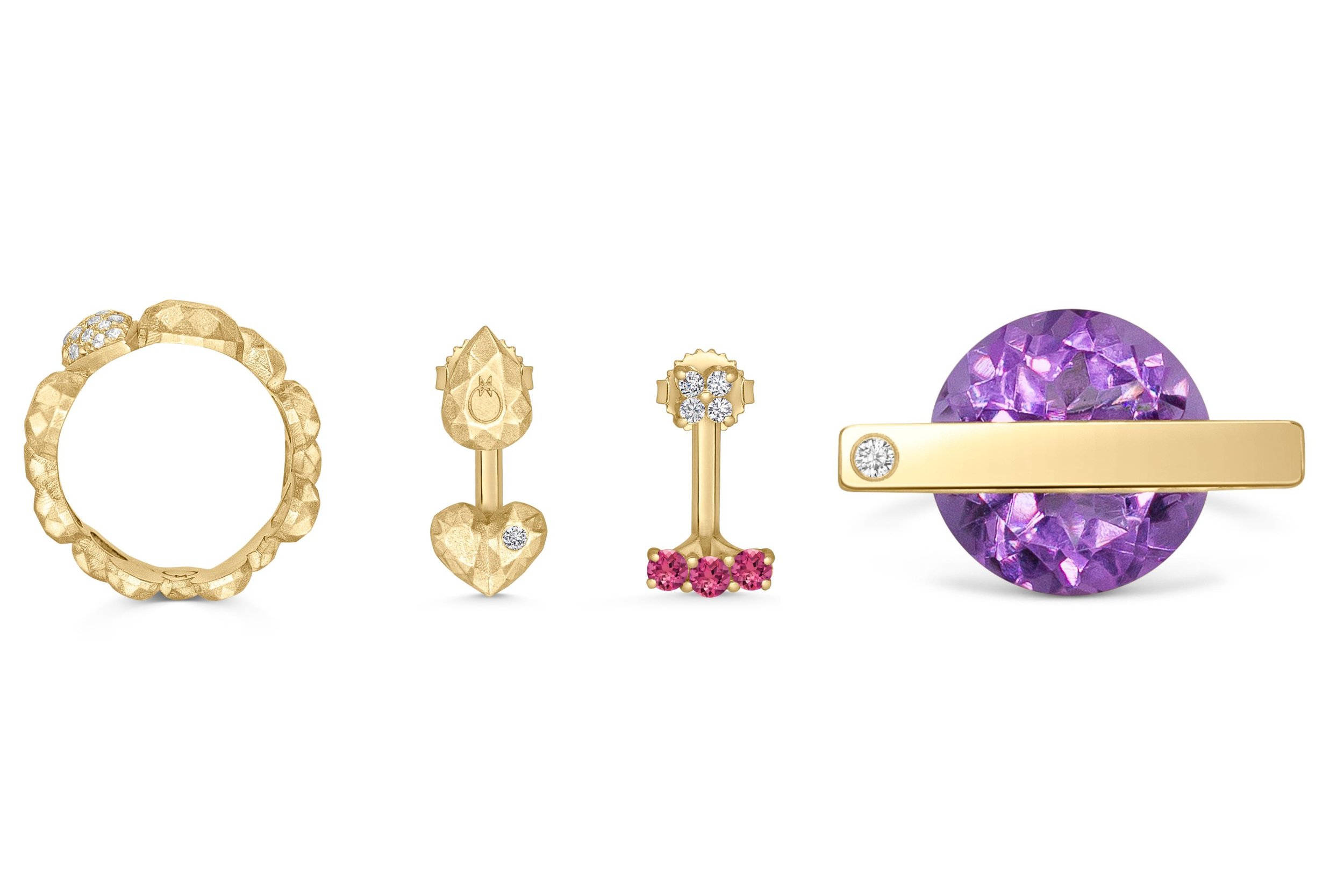 Left to right: Pepita Cluster ring in 14-carat gold with diamonds; Interchangeable & Pepita earrings in 14-carat yellow gold, set with diamonds and tourmaline; Tension Setting ring in 14-carat gold, set with an amethyst and a diamond.