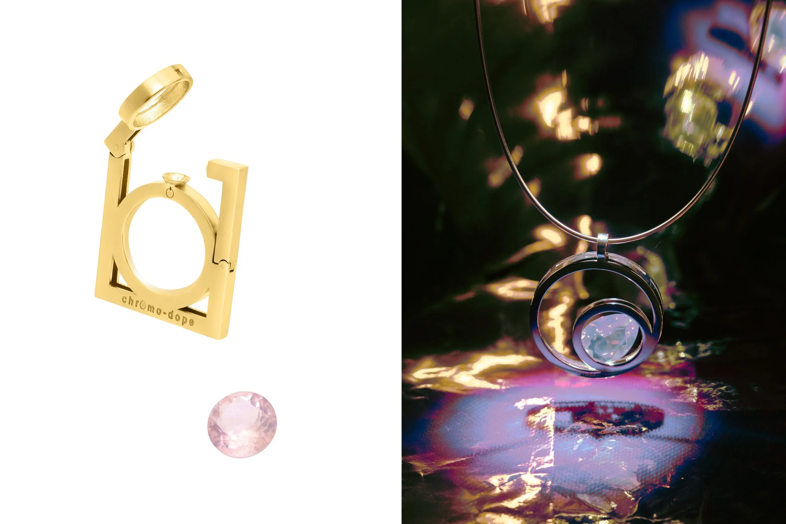 Left to right: Chromo-Dope 9-carat gold ring with interchangeable gemstone; Chromo-dope necklace. (Photo: Antonio Miucci)