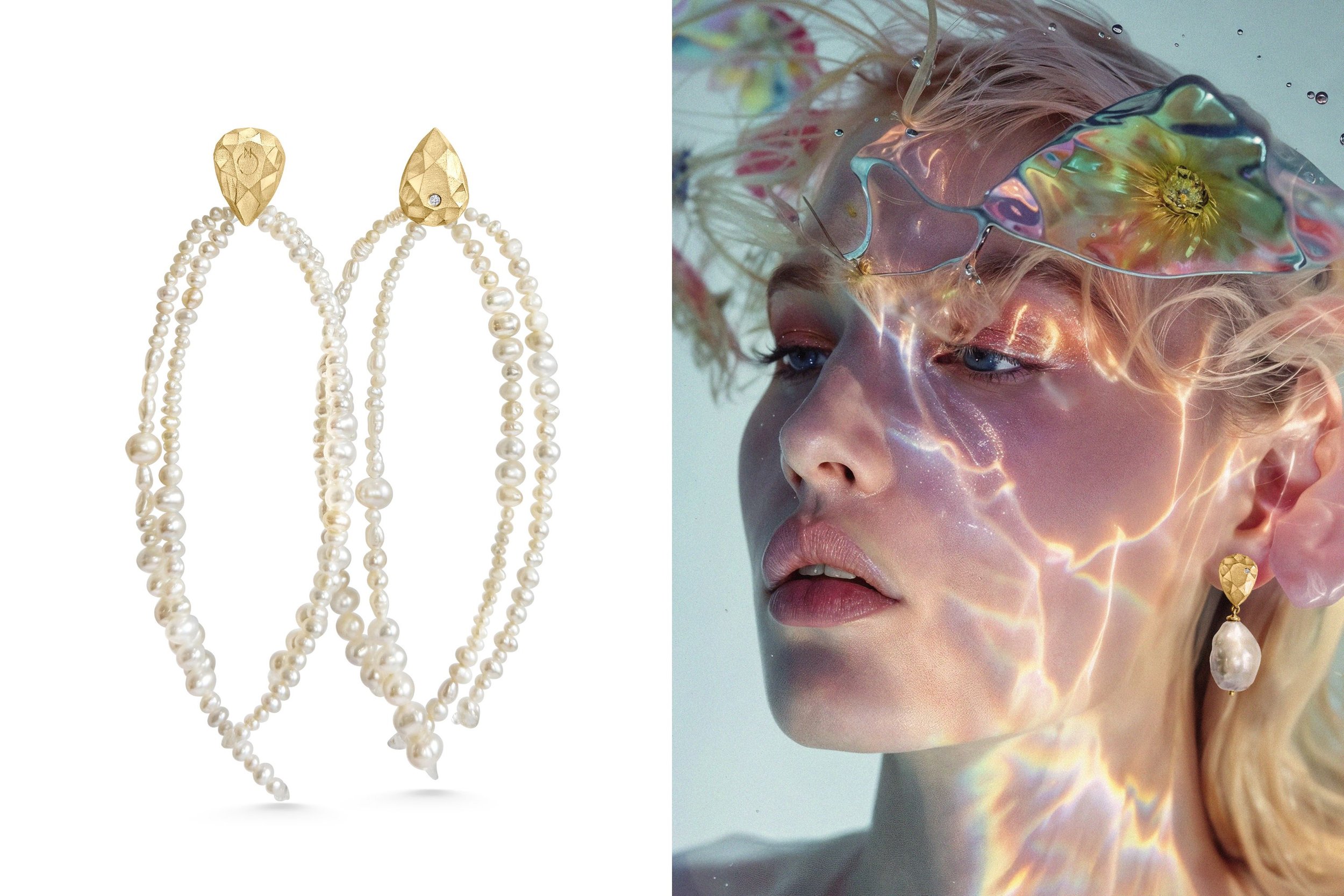 Left to right: Pepita Pearl Strand earrings with pearls cascading from 14-carat gold studs set with a diamond; Pepita Pearl earrings in 14-carat gold with baroque pearls and diamonds.