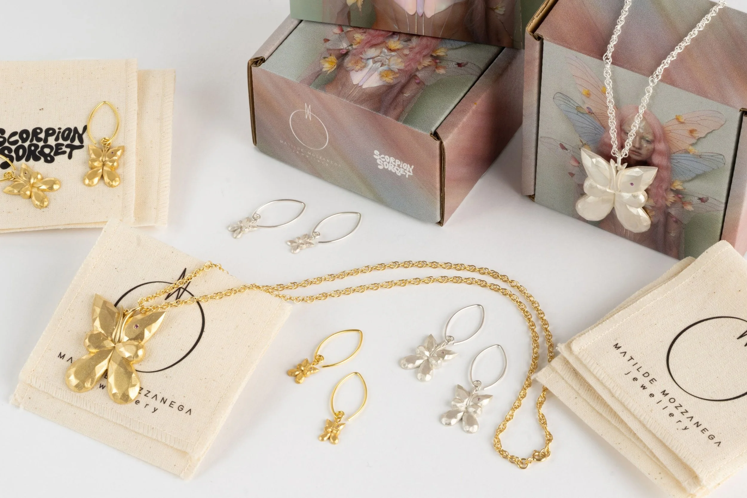 Pepita Butterfly earrings and necklaces, made in collaboration with the artist Scorpion Sorbet.